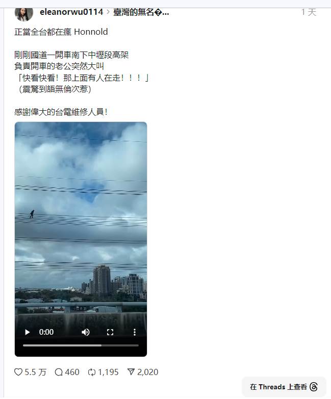 原PO在社群平台Threads上分享這段經歷,表示當時正與丈夫開車經過中壢高架路段,丈夫突然驚呼「上面有人在走!」她抬頭一看,赫然發現一名身穿工作服的維修人員正小心翼翼地行走在高壓電纜上,底下就是車速飛快的國道車流。