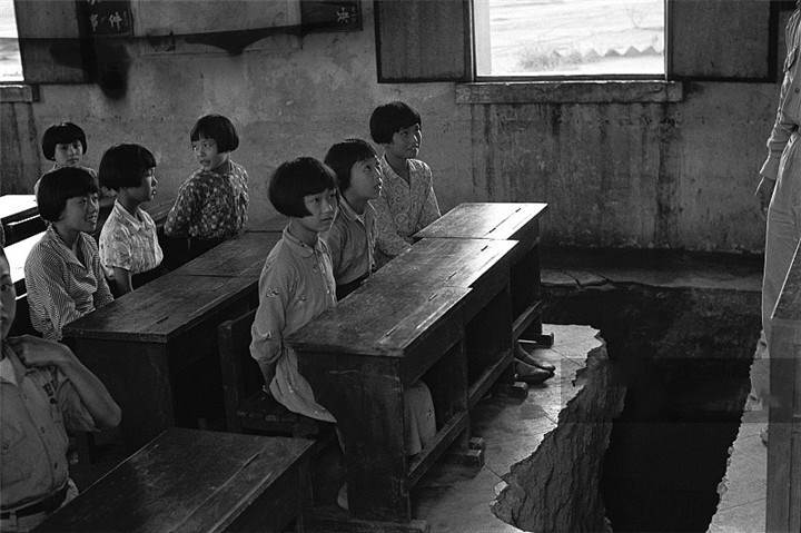 2、金門一所小學高年級女生正在上課,雖是清貧年代,學生模樣清秀,整潔有禮,散發著朝氣。教室前是新挖掘的戰壕,這是一個十分特殊的戰備防御工事。