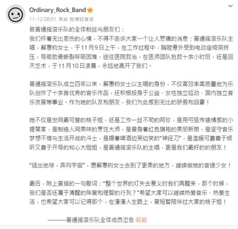 大陸演藝界傳出憾事!獨立音樂團體「普通搖滾樂隊」的女性主唱解惠鈞(藝名阿珍),于11月9日上午在浙江嘉興進行工作時,突然遭到劇場內的電動椅架夾傷胸腔部位,造成多根肋骨當場斷裂、呼吸困難,緊急送院後雖經醫療團隊全力搶救超過10個小時,仍于11月10日凌晨宣告不治。