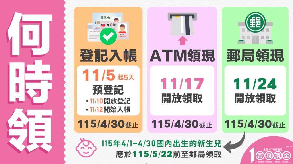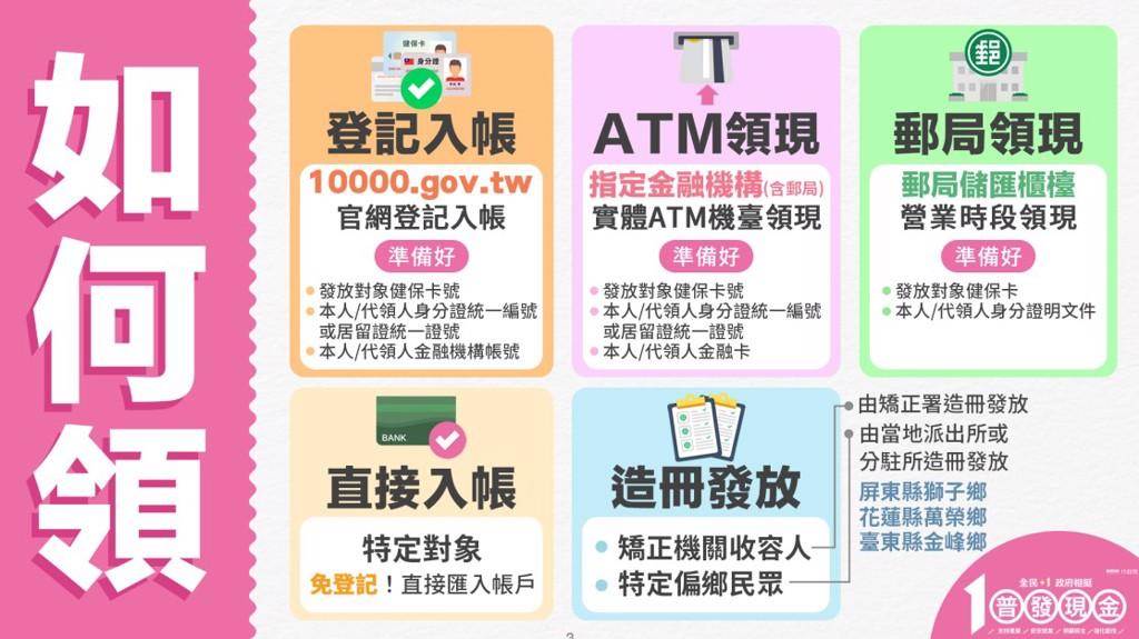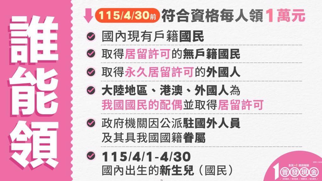 針對本次普發現金發放資格及領取方式,財政部表示,本次普發現金的發放資格包括國內現有戶籍國民、各級政府機關因公派駐國外人員及其具我國國籍眷屬、大陸地區人民與港澳居民及外國人為我國國民之配偶且取得居留許可者、取得永久居留許可之外國人及115年4月1日至4月30日國內出生之國民等;領取方式採「登記入賬」、「ATM領現」、「郵局領現」、「直接入賬」及「造冊發放」5種方式。