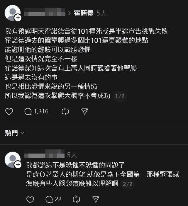 根據《ETtoday新聞雲》報導,這位網友在Threads平臺發文預測,即使霍諾德過往攀登過無數更艱難的地點,但這回有上萬人同步觀看的壓力是前所未有的,他認為霍諾德會中途放棄,甚至不排除摔死的可能。面對質疑聲浪,原PO還氣憤反擊,強調問題在于「背負眾人期待、必須拿下全國第一的緊張感」,更宣稱24日延期是因霍諾德壓力過大而非天候因素,自信喊話「我預感這篇明天就成為神串」。