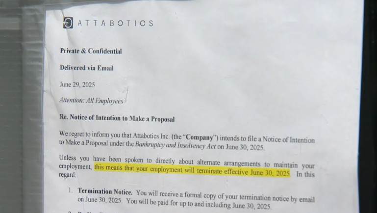事件爆發于6月29日晚間,公司透過電子郵件通知所有職員,隔天起全面停止上工,並表示將收到正式的解聘通知,加拿大產業部更在7月1日已收到Attabotics的破產保護聲明。令人意外的是,這封解僱信竟未提及任何資遣費、員工福利或費用報支等事項,僅要求員工歸還公司所有財產。其官網宣稱擁有超過300位員工,但實際上僅約150人收到解聘通知書。
