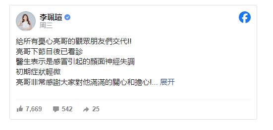 李珮瑄在文中表示,「給所有憂心亮哥的觀眾朋友們交代!亮哥下節目後已看診」,透露郭正亮的病情是感冒引發的顏面神經失調,所幸癥狀尚屬輕微,因此沒有大礙。而她也代為轉達郭正亮話語,感謝粉絲對他的擔憂與關心,「在此謝過大家!」。