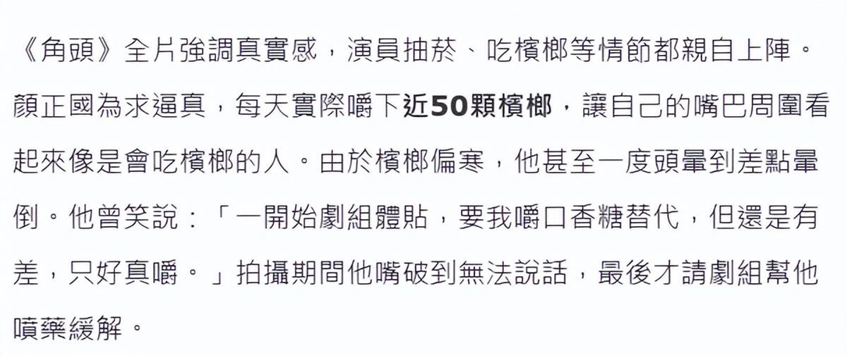 顏正國曾以童星身份紅遍台灣,卻誤入歧途成為階下囚,知情人爆料,顏正國去年確診肺腺癌,沒想到發展得那麼快。他晚年在電影《角頭》出演黑幫人物,為求逼真每天嚼下50顆檳榔,一度在片場暈倒,嘴唇咬破,甚至無法說話,對演戲近乎癡迷的程度。