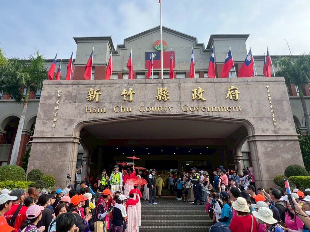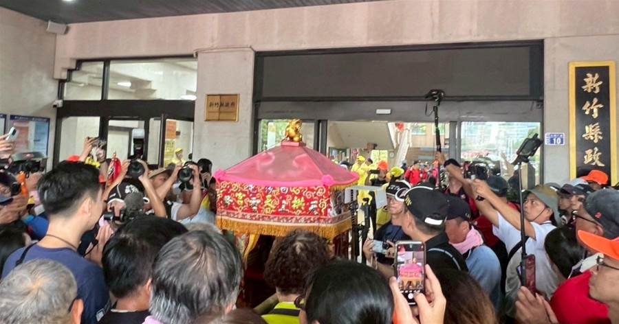 「粉紅超跑」停駕新竹縣政府。(圖/翻攝自白沙屯拱天宮臉書)
