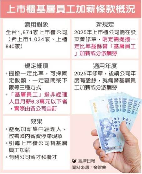 很多人賺錢就是為了掙一口飯吃,不過如果進入公司沒當主管,又沒有加薪,一輩子薪水鎖死在那,要達到財富自由也非常困難。對此,現在就有新政策,企業將被要求提撥部分盈餘調整基層員工薪資,這項被稱為「加薪條款」的新規定,即將為台灣職場帶來重大變革。2026年起,全臺近兩千家上市櫃公司的基層員工將可望獲得實質的待遇提升。