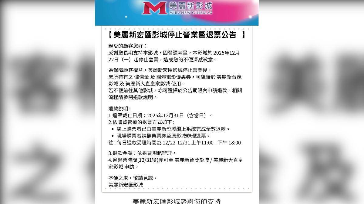 美麗新宏匯影城今(22)日突,懷著非常不捨與遺憾的心情通知,因營運考量,美麗新宏匯影城將于 2025/12/22(一)起停止營業, 宏匯影城儲值金與團體電影優惠券,仍可于美麗新台茂影城/美麗新大直皇家影城繼續使用,若不便前往其他影城,亦可于期限內申請退款。