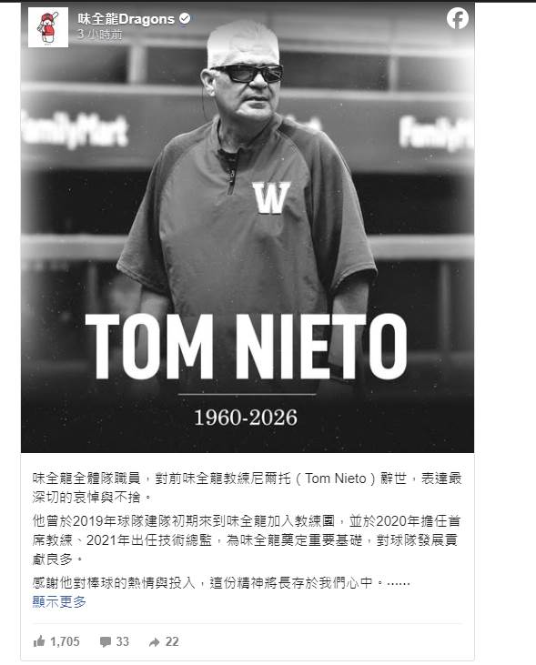 體壇震撼彈!美國媒體《Zone Coverage》報導,前味全龍教練尼爾託(Tom Nieto)于3月27日心臟病發離世,享年65歲。味全龍稍早也在社群證實死訊,並感謝尼爾託此生對棒球的熱情與投入。
