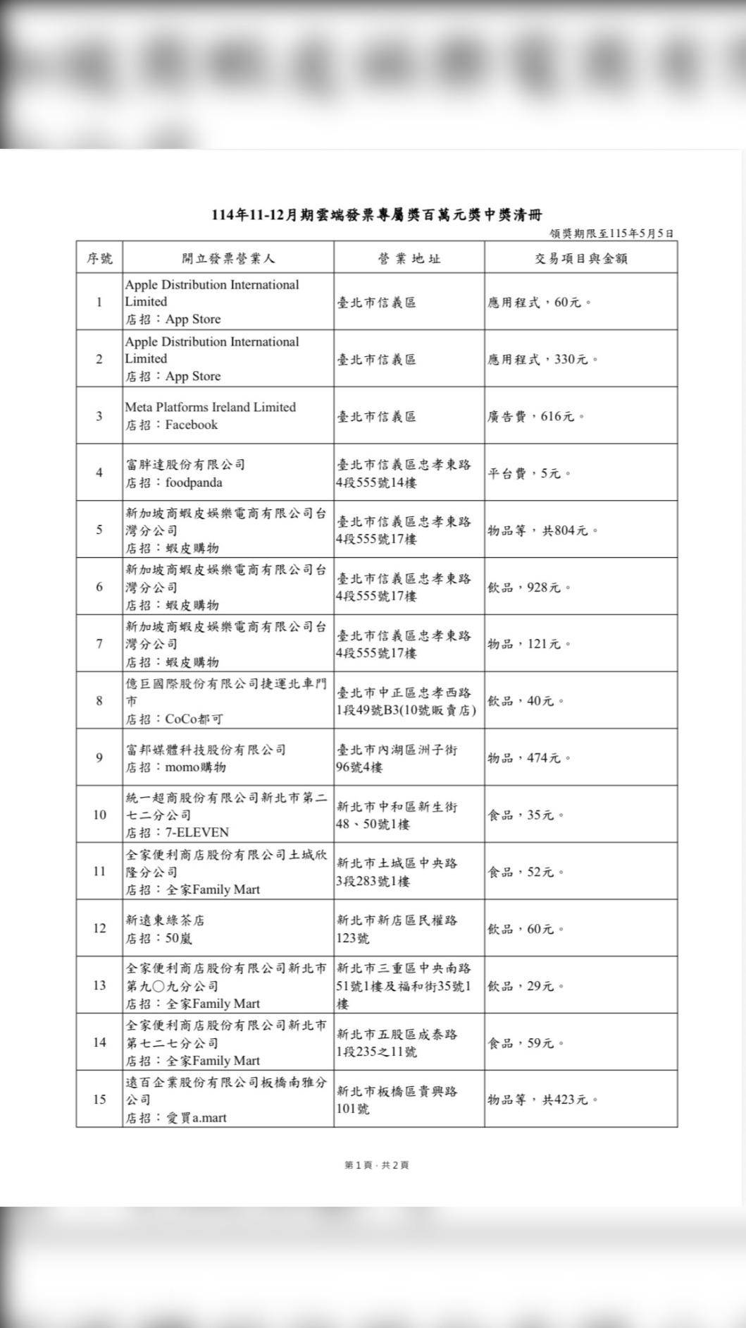 又到了對發票的時刻,財政部(4)日公佈去年11-12月雲端發票百萬獎清冊,開出30張,最低消費金額落在宜蘭市,中獎民眾僅花費1元買購物袋中百萬;另有2名民眾在CoCo捷運北車門市花40元、新北市新店區民權路123號50嵐以60元購買手搖飲料中獎百萬。