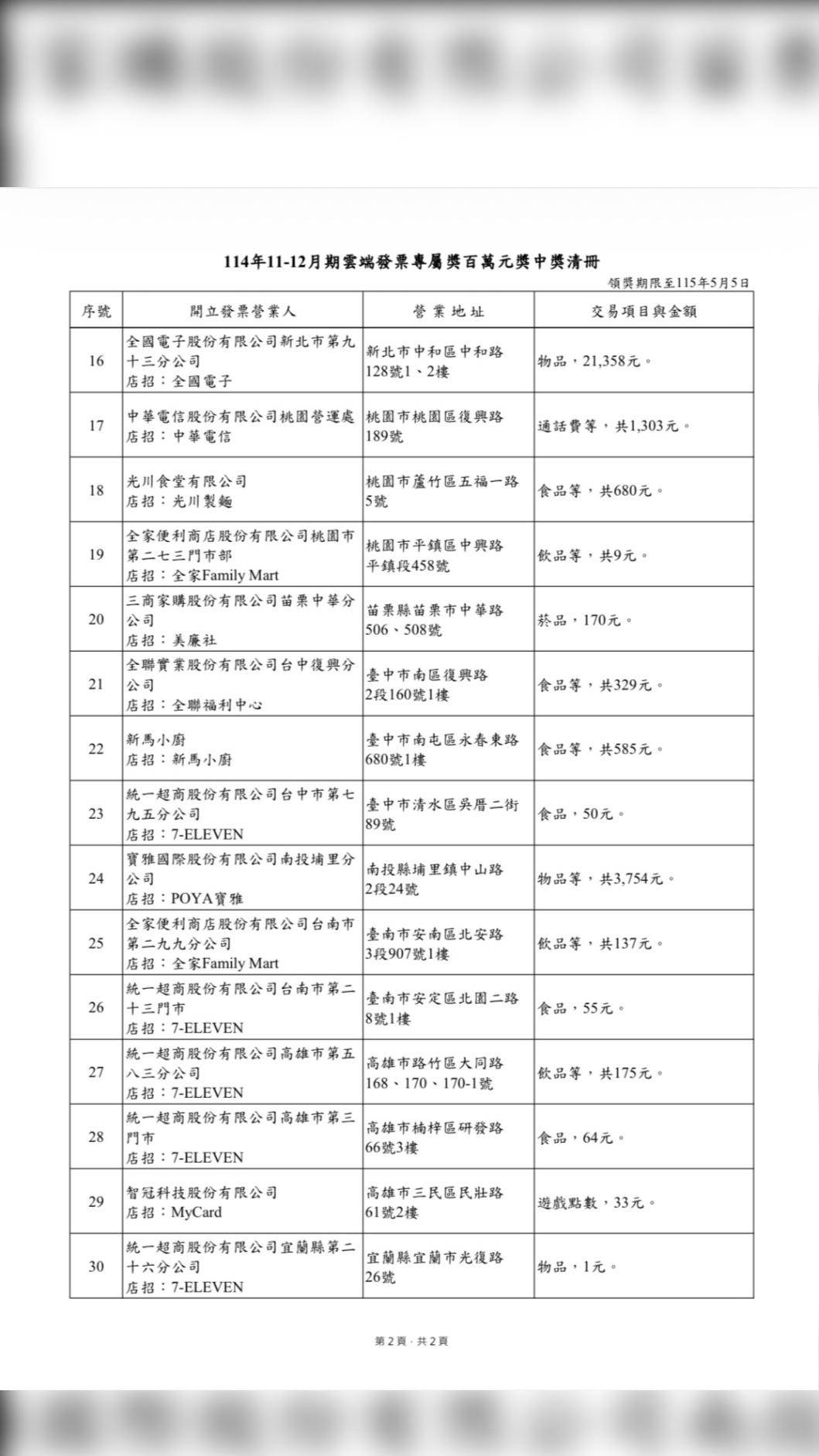 有趣的是,本期百萬獎多數為至便利超商消費,價格多為數十元至百元。最高昂的交易專案落在新北市中和區中和路128號1、2號,中獎民眾在全國電子購買物品,花費21358元;最低價物品則是在宜蘭縣宜蘭市光復路26號,民眾購買購物袋,以1元中百萬大獎。