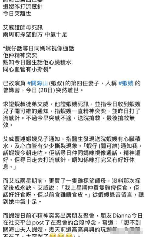 只不過在離世前一天曾經打過流感針,打完后也是正常休息,沒操勞什麼,結果第二天人就沒了,實在令人唏噓!