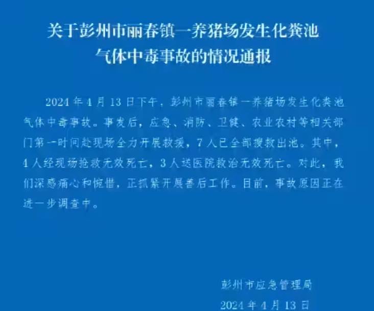 根據《Yahoo奇摩新聞》報導,陸媒指出中國四川省彭州市傳出奪命意外,四川省彭州市應急管理局獲報,在麗春鎮一家養豬場發生化糞池氣體中毒事故,隨即與消防、衛健和農業等相關部門,在第一時間趕往現場全力救援,從化糞池中救出7人。