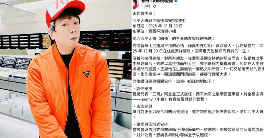 治喪小組表示,根據公告內容,經親屬代表、曹西平三哥曹南平同意並正式委任,後續喪禮事務將全權交由與四哥情同父子的乾兒子謝兒彌(小俊)負責統籌與對外聯繫,目前靈堂設置與告別式相關細節正積極籌備中,治喪小組表示待地點、開放致意時間及儀式流程確認後,將統一對外公告,懇請各界耐心等候。