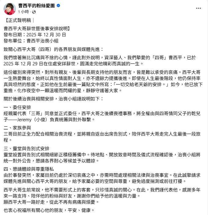 曹西平治喪小組發聲明。(圖/翻攝「曹西平的粉絲愛團」)