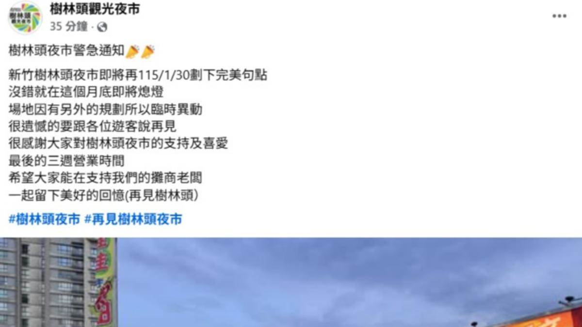 也有攤商感嘆:「太突然了!」原本想趁著農曆春節大賺新年財,沒想到被通知夜市要停業,讓所有攤商都措手不及,哀號「今年的年難過了!」樹林頭夜市粉絲專頁稍早也在臉書貼文證實停業訊息:「沒錯就在這個月底即將熄燈,場地因有另外的規劃所以臨時異動,很遺憾的要跟各位遊客說再見,很感謝大家對樹林頭夜市的支援及喜愛,希望大家能再支援我們的攤商老闆,一起留下美好的回憶(再見樹林頭)!」