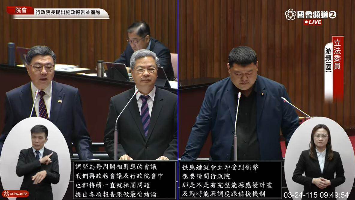 遊顥在質詢時指出,過去三週油價持續上漲,中油透過補貼與凍漲機制吸收成本,上週漲1.5元、本週漲1.8元,但實際上這些成本都是由全民納稅錢買單。