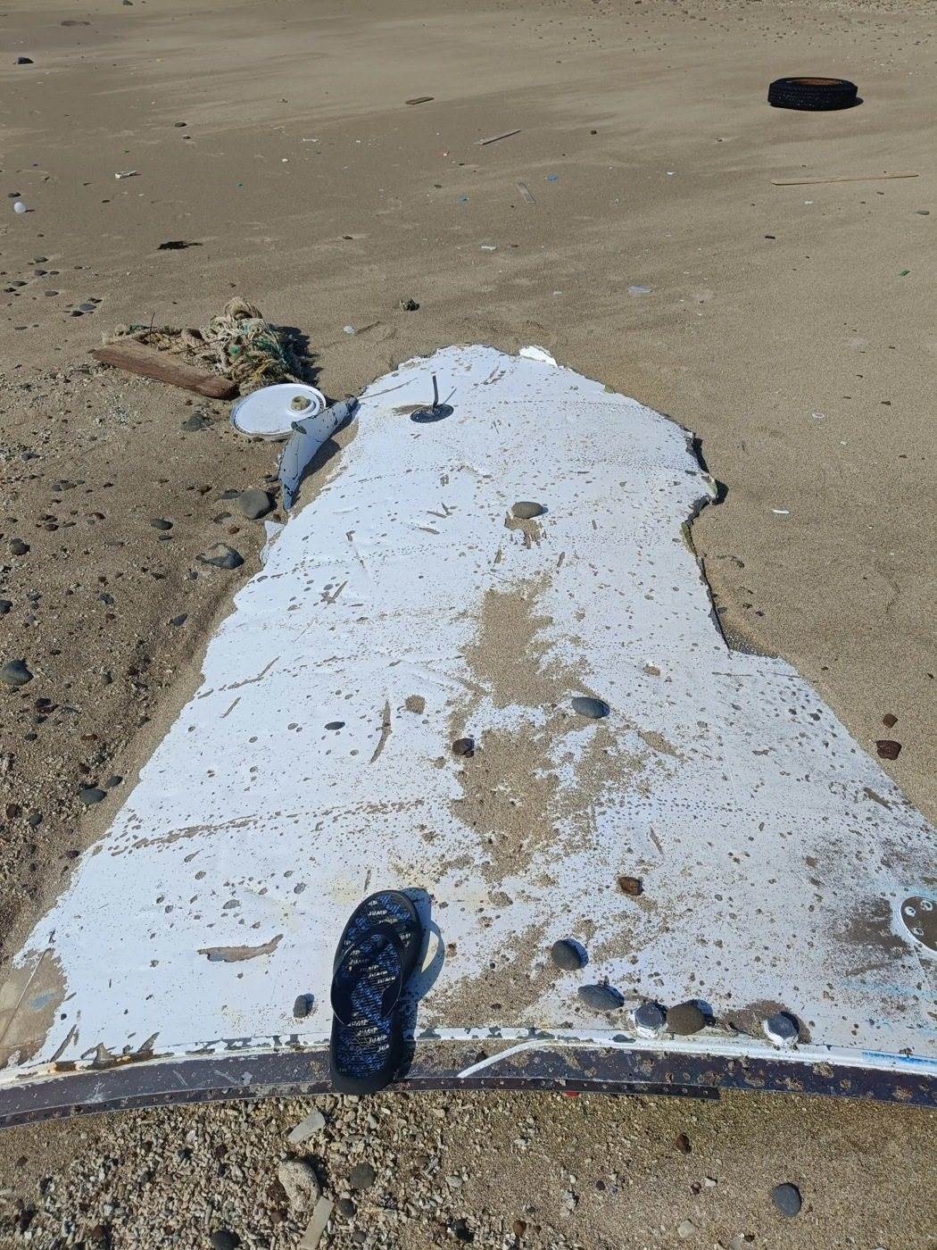 澎湖西嶼小門沙灘潮間帶今天下午發現一塊大型金屬殘骸,疑似飛機外殼,鑑定後排除為失事戰機。