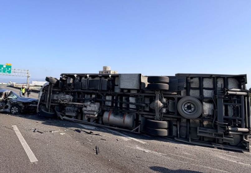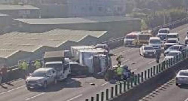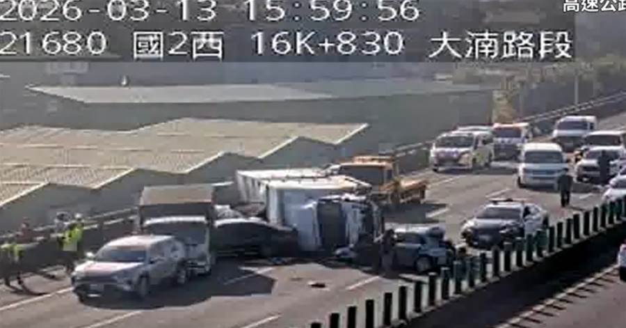 國道2號今(13)日發生一起重大交通事故,下午3時許東向16.7公里處7輛車嚴重追撞,1輛大貨車、2小貨車及4小客車撞成一團,其中一輛小貨車反覆在車道上,現場至少6人受傷,交通事故佔據外側2線車道。