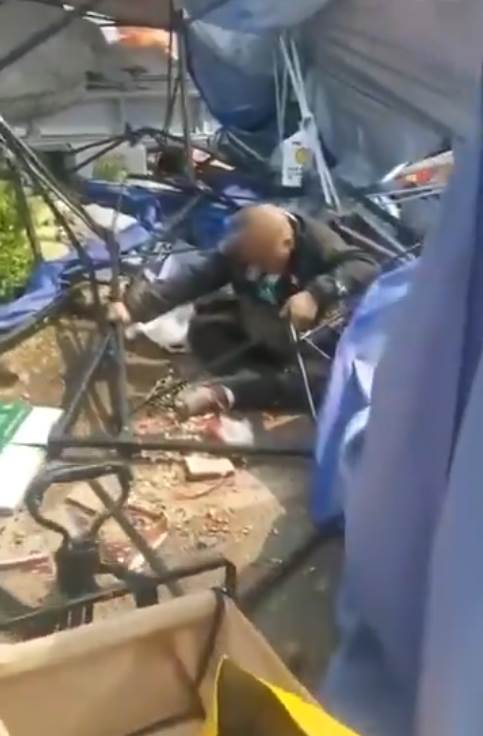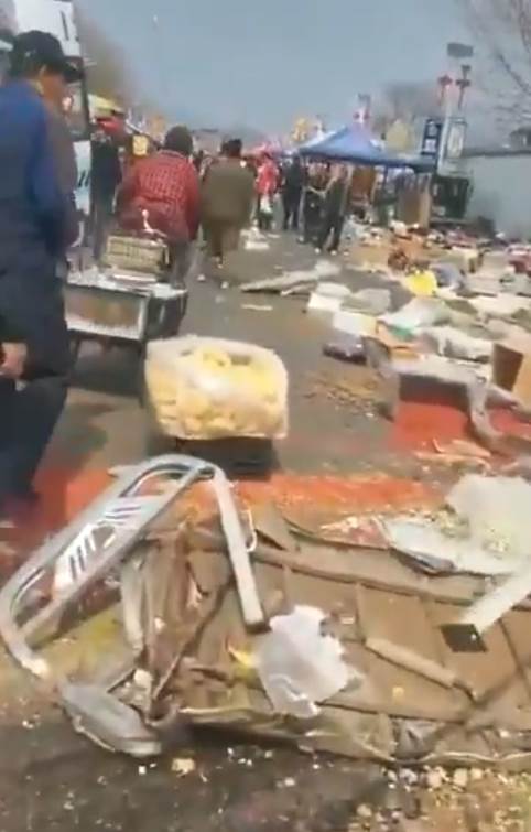 事發現場一片狼藉,地面散佈著大量雜亂物品,賬棚也被撞得歪七扭八,許多人橫躺在地毫無動靜,地上還出現了疑似血液的痕跡。最終有勇敢的民眾合力將這名駕駛從鏟土機上強行拖出,並對他展開圍毆。