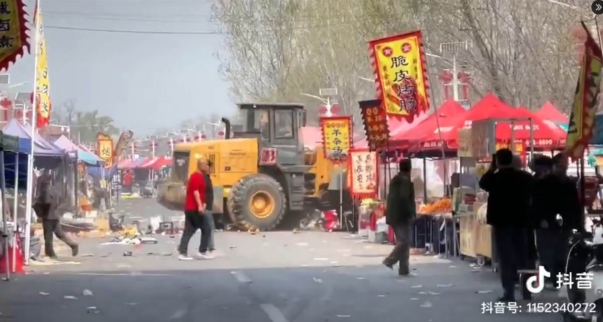 網路瘋傳的恐怖畫面顯示,這輛鏟土機在密集的人群中往返多趟進行碾壓。現場可見眾多攤位被撞得支離破碎,各式商品四處飛散,部分來不及閃避的攤販被捲進車底。周遭民眾情急之下,紛紛抓起手邊任何東西朝向駕駛座投擲,試圖阻止這場悲劇,但駕駛仍持續進行破壞行動。