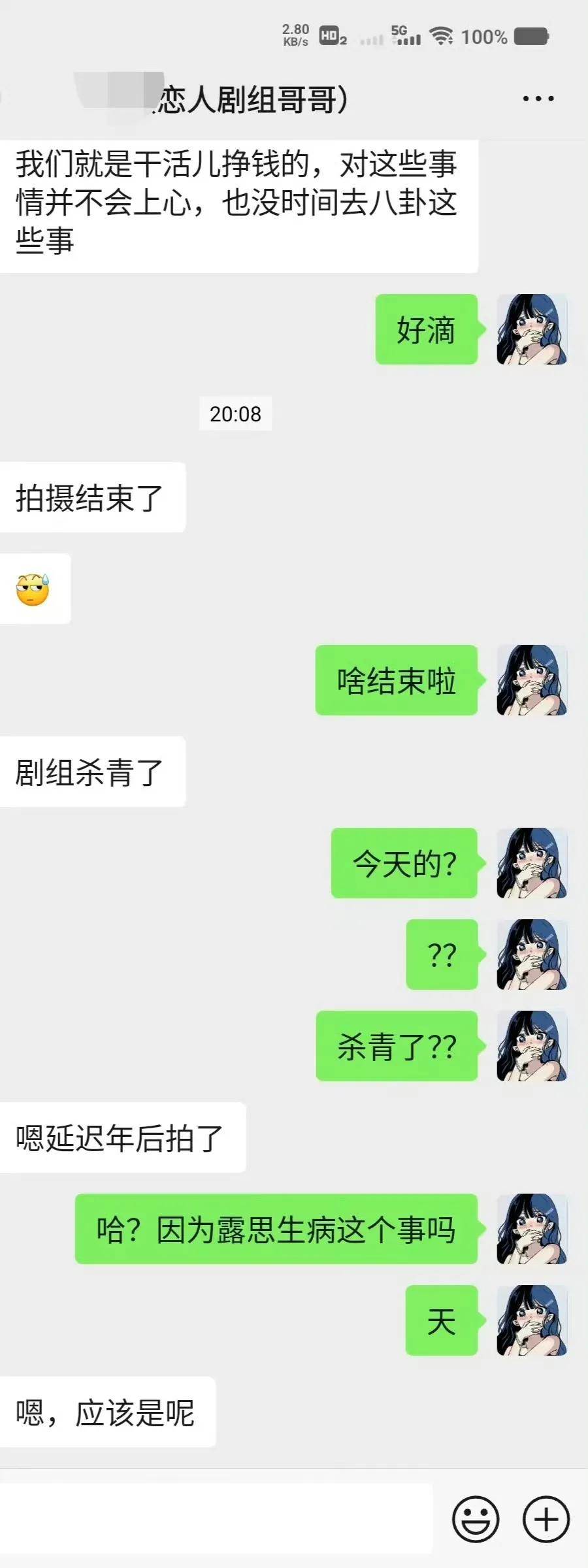 目前,「戀人」劇組的工作人員聊天截圖曝光,趙露思部分的戲已經推遲到了年后拍攝,其他演員也馬上結束手頭的戲份,可能要停拍,具體細節工作人員稱不方便透露,他們也不了解外面的八卦。