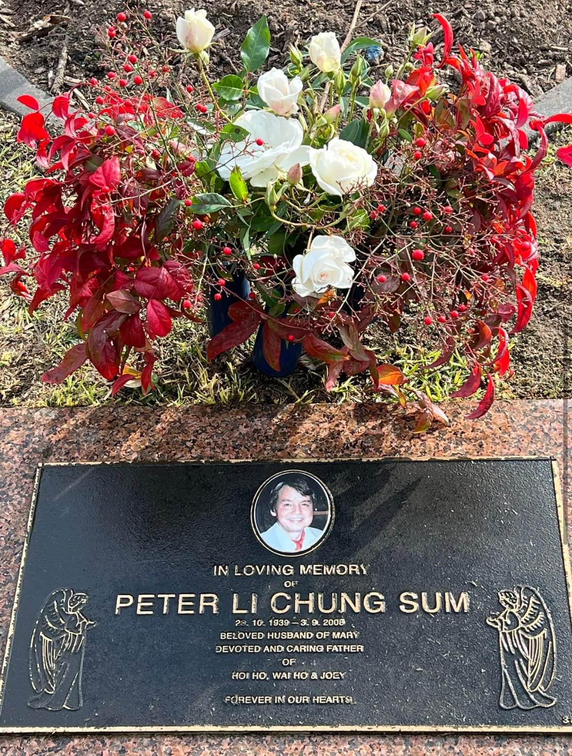 李忠琛的墓碑很簡單,上面有他生前的彩色照片,下面是他的英文名以及粵語的讀音拼音,還有出生年月日以及離世的時間。特別留意到墓碑下有一行字是「Beloved husband of Mary」(張瑪莉深愛的丈夫),最下面還有張瑪莉一子一女的名字,顯然這個墓碑就是張瑪莉及其子女為他而立的。李忠琛只是張瑪莉的前夫,在與李忠琛離婚之后,張瑪莉在2012年再度結婚嫁給了余文平,組建了新的家庭,即便這樣張瑪莉依然很掛念對方,由此可見張瑪莉對李忠琛的感情依然很深厚。