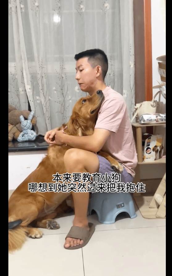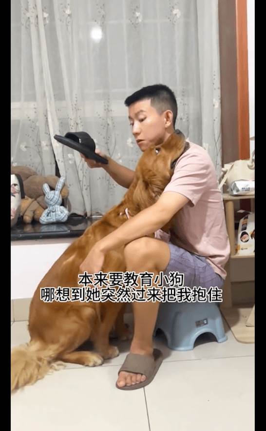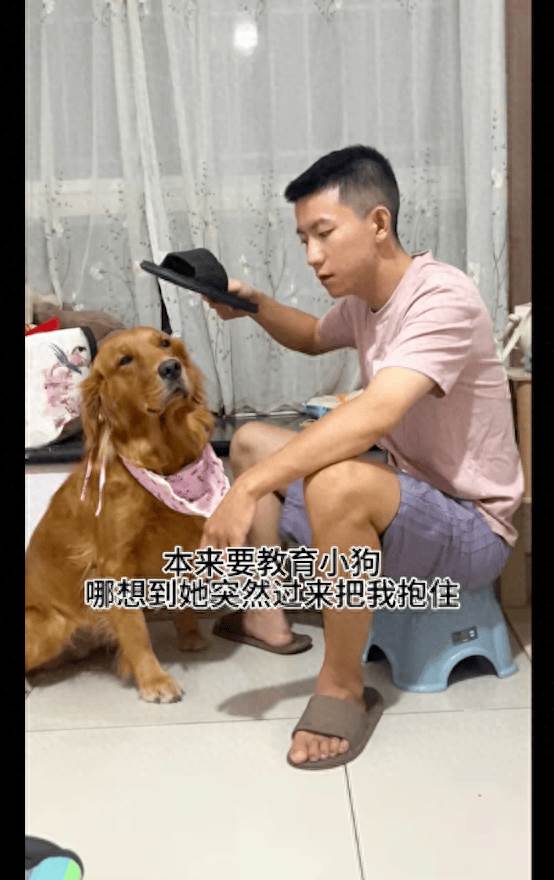 這場面瞬間變得格外溫馨,主人的怒氣似乎被金毛那一副嬌憨的模樣給完全打敗了。看到金毛撒嬌的樣子,主人頓時感到有些無奈。他本來是想懲罰教育它一下,但此時心里的生氣已經消散殆盡。拖鞋也早已被丟到一旁,主人看著金毛的表情,幾乎沒有辦法再繼續嚴厲下去。