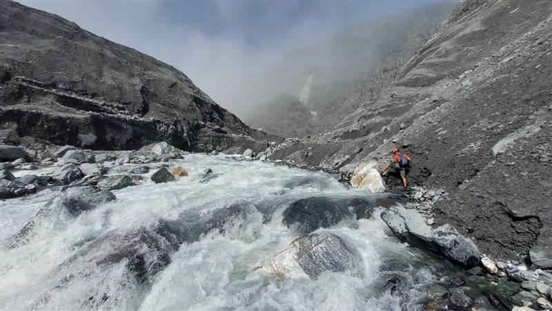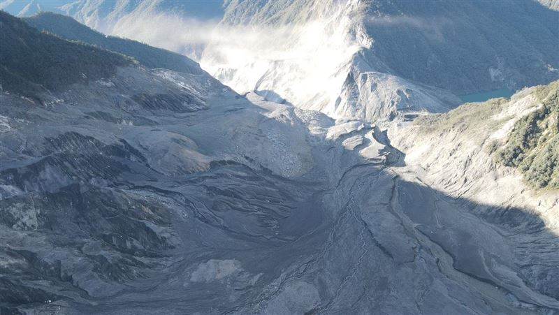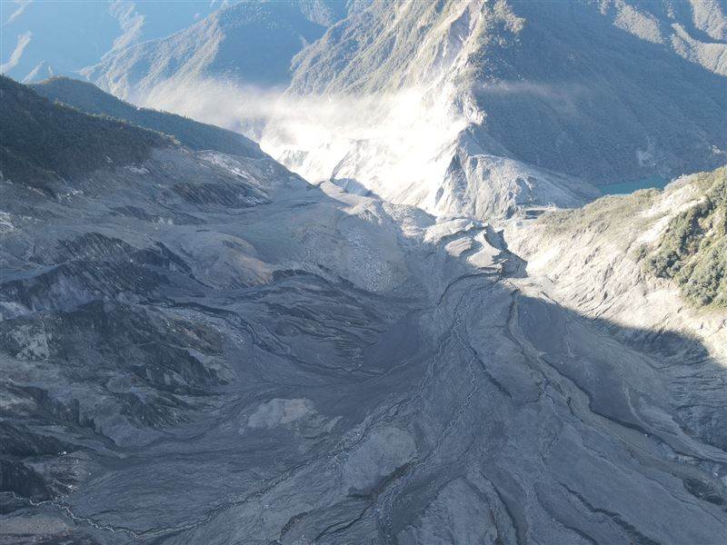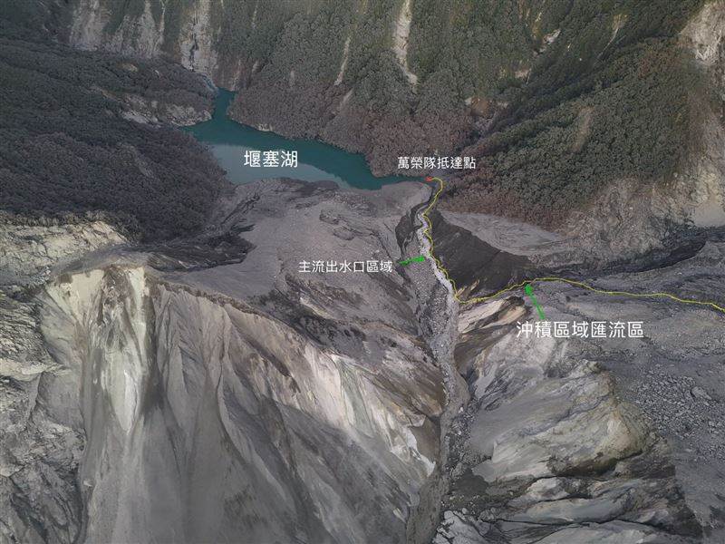 同時發現,堰塞湖溢流後短短兩週內河道已被沖刷加深逾百公尺,沿途可見溪水侵蝕力強大、峭壁陡峭,顯示短期河相與地形變化劇烈。溢流口位置相較先前空拍資料明顯後退,證實該地區仍持續快速演變。