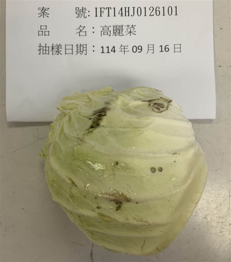 由峻妍有限公司進口的越南「高麗菜(FRESH CABBAGE)」,檢出殘留農藥三泰隆0.03 ppm,依據「農藥殘留容許量標準」,三泰隆以其他(蔬果類)*0.01 ppm 為法規容許值,不符合食品安全衛生管理法第15條第1項第5款規定,2萬3400公斤依規定退運或銷毀。