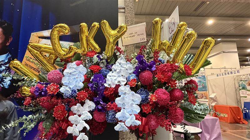 周杰倫送上花籃,展現師徒情誼。(圖/記者徐珮華攝影)