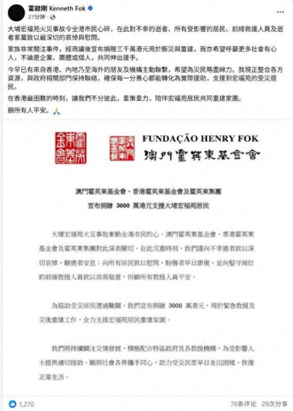 首先是大家都非常熟悉的霍家,對于這次的火災,霍家選擇捐贈3000萬的港幣。