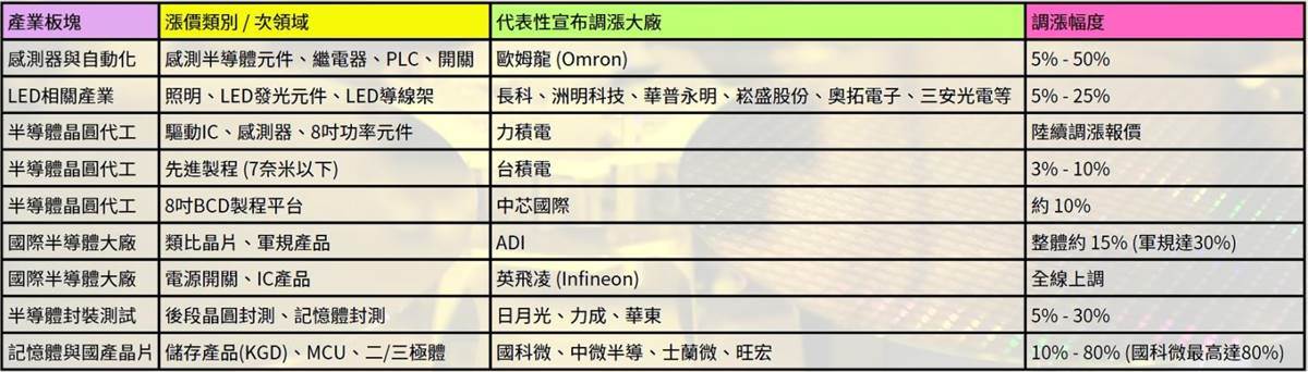 在感測半導體及自動化方面,日本大廠歐姆龍(Omron)也將感測半導體元件、繼電器、PLC等產品自即日起調漲5%至50%;晶圓代工廠力積電也已于年初調漲感測半導體元件與驅動IC的價格,8吋功率元件代工報價調漲。晶圓代工大廠臺積電則宣佈調漲7奈米以下先進製程3%至10%的價格,中芯國際則對8吋BCD製程平臺調漲約10%。
