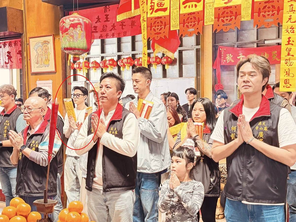 粿粿站在最邊邊,戴著棒球帽與口罩遮掩,低頭參拜。(圖/翻攝自大溪鳳山寺廣澤宮臉書粉專)