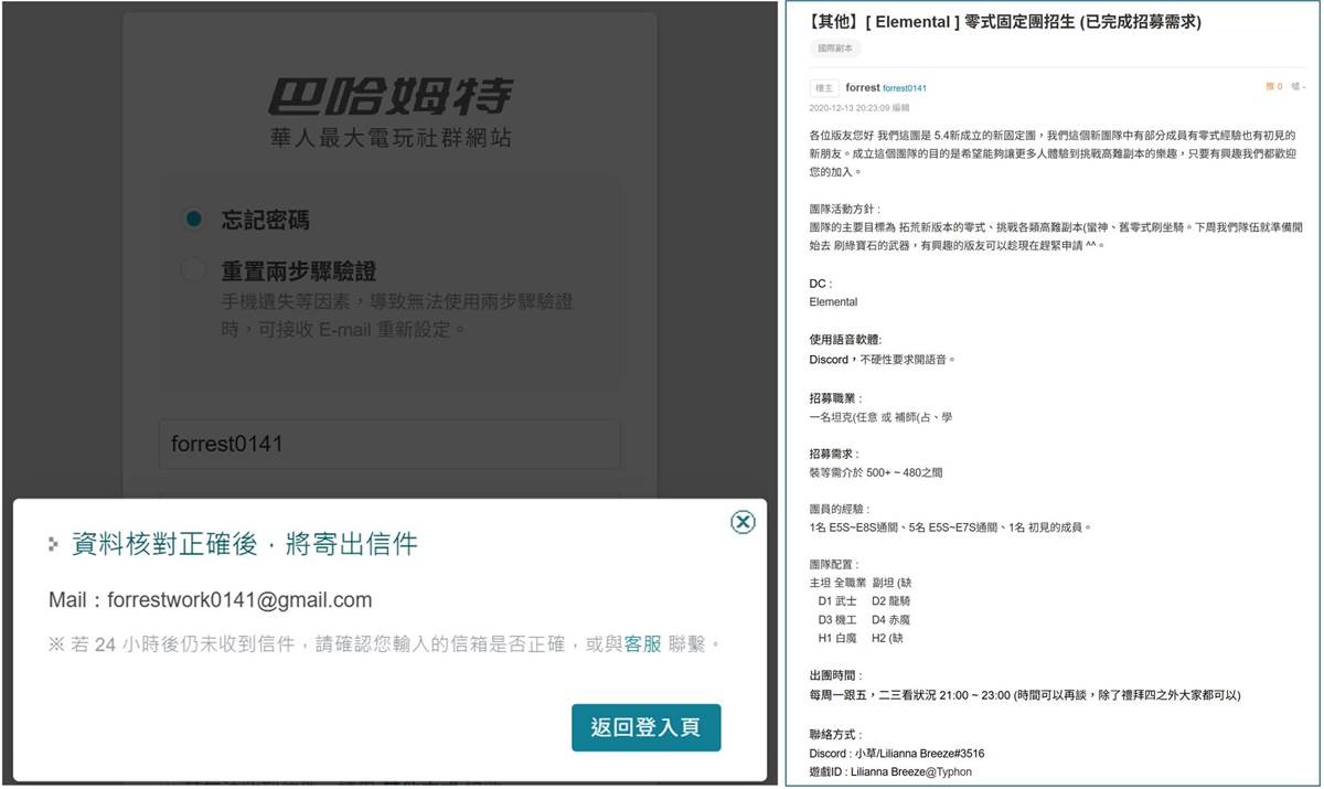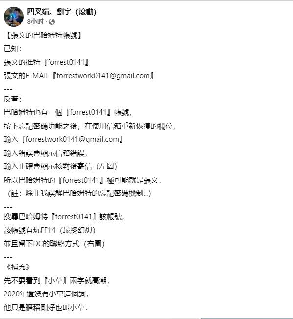 網紅「四叉貓」近日透過比對張文已知使用的推特與電子郵件賬號名稱,進一步搜尋網路平台資料,發現知名論壇「巴哈姆特」上,曾出現一組暱稱同為「forrest0141」的賬號,研判可能與張文本人有所關聯。該賬號于2018年8月註冊,主要討論遊戲《最終幻想14》,並曾留下Discord與遊戲ID等聯絡資訊,其中Discord暱稱為「小草」。