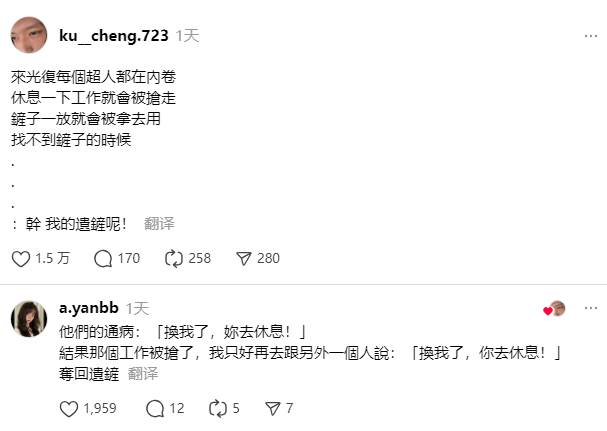 無獨有偶,也有身為「鏟子超人」的網友在Threads發文指出,來光復鄉的每個超人都在內卷,只是休息一下,工作就會被搶走,鏟子一放下就會被拿去用,讓他常常找不到鏟子時,不禁想問:「O!我的遺鏟呢?」