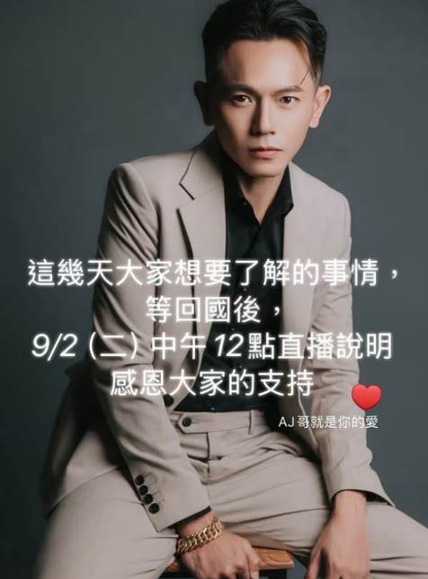 對于指控記者已去訊女秘書詢問,截稿前尚未獲得回應,而AJ哥于30日發文表示:「這幾天大家想要了解的事情,等回國後,9/2(二)中午12點直播說明」。