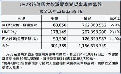捐款超人愛心已破11.5億元。9月23日花蓮馬太鞍溪堰塞湖災害發生迄今已20日,賑災基金會今(13)日表示,迄今募得款項超過11.5億元,家園慰助金已陸續發放,開始進入第二階段,預計將對弱勢家庭提高補助,會與衛福部相關單位討論後儘速提出。