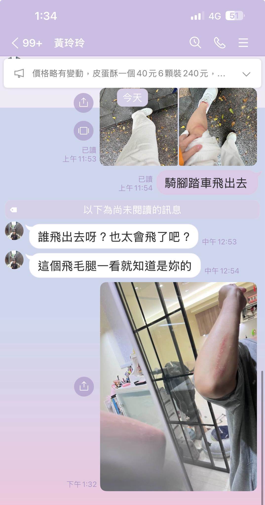 此外,米可白交通事故當下,也立刻傳訊息給媽媽報平安,並拍傷勢照討拍。怎料,媽媽卻回應「誰飛出去呀?也太會飛了吧?這個飛毛腿一看就知道是妳的」,讓米可白笑說「我嚴重懷疑黃玲玲小姐(媽媽),她真正關心的不是我有沒有受傷,而是...車有沒有壞?」母女逗趣對話笑翻粉絲。