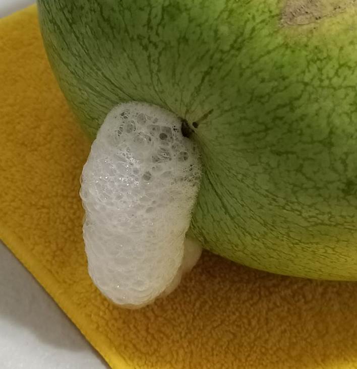 當西瓜過熟或受損后,果肉中的糖分會加速發酵,生成大量的二氧化碳氣體。這些氣體被封存在堅硬的瓜皮中,無法釋放,壓力逐漸增大,最終導致內部氣體通過瓜皮的弱點向外擠出,形成「吐白沫」的現象。