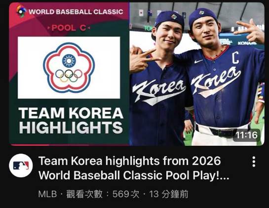 從截圖可看出,雖然影片內容主要呈現韓國隊在經典賽中的精彩表現,但封面卻使用了中華隊的會旗與相關視覺元素,兩支不同國家的元素同時出現,形成奇特的畫面組合,很快就被眼尖的球迷發現。