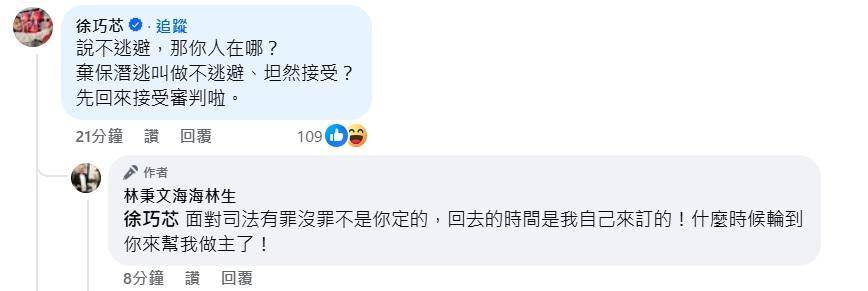 徐巧芯則回嗆,林秉文身為通緝犯,現在能為社會做的唯一正面貢獻就是「趕緊歸案接受調查」,並逐點駁斥:「1、我沒跟你吃過飯。2、你棄保潛逃就是干擾司法。3、你要虛心聆聽反思就先回國。4、沒有什麼民主潛逃這種事。」