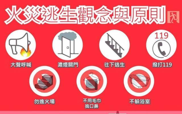 火警初期:小火快跑、關門避難。 受困時:開窗、關門、塞門縫、等救援。