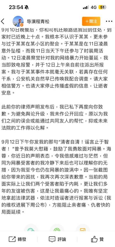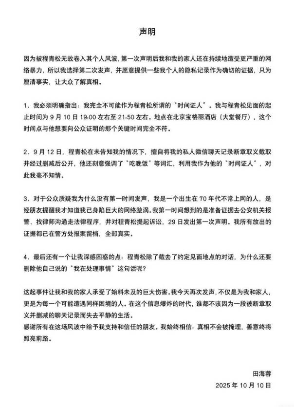 事件進一步發酵的導火線,源于程青松在個人微博上發文自證清白。他強調自己「根本不認識于某某」,並試圖以9月10日晚間與田海蓉共進晚餐為由,提出不在場證明。