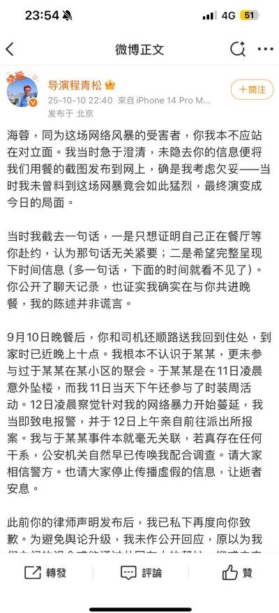 對此,程青松隨即回應,解釋刪除訊息是因「下方時間被截斷」,並重申自己于晚餐後即返家、隔日仍出席時裝周活動,與案情毫無關聯。