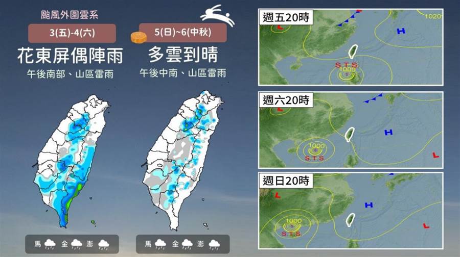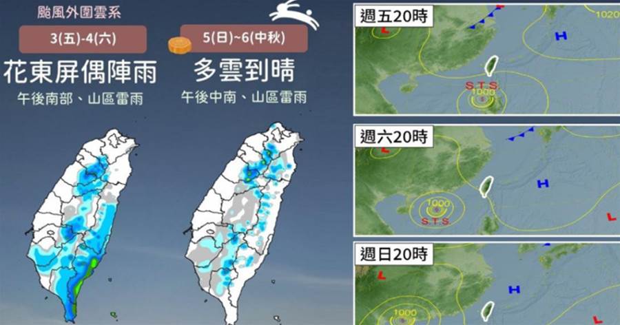 熱帶擾動93W已增強為熱帶性低氣壓或「麥德姆颱風」,外圍雲系將為花東及屏東帶來短暫陣雨。氣象署預報員林定宜指出,颱風將在本週五、六橫過呂宋島及南海,受其影響,台灣東南部將有不穩定天氣。不過,隨著太平洋高壓增強,中秋節當晚全台多數地區預計可見月亮,賞月機會高,僅南部雲量較多。