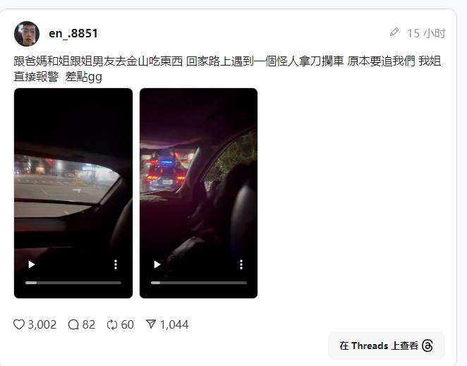 新北市金山區今(11)日晚間發生隨機攻撃事件,一名44歲翁姓男子于晚間7時58分,在金山區環金路與中正路口全家超商前,徒步攔車並左右手都持刀(1把短刀、1把鐮刀)作勢攻擊,干擾多輛機車與汽車通行,警方獲報後立即處理。