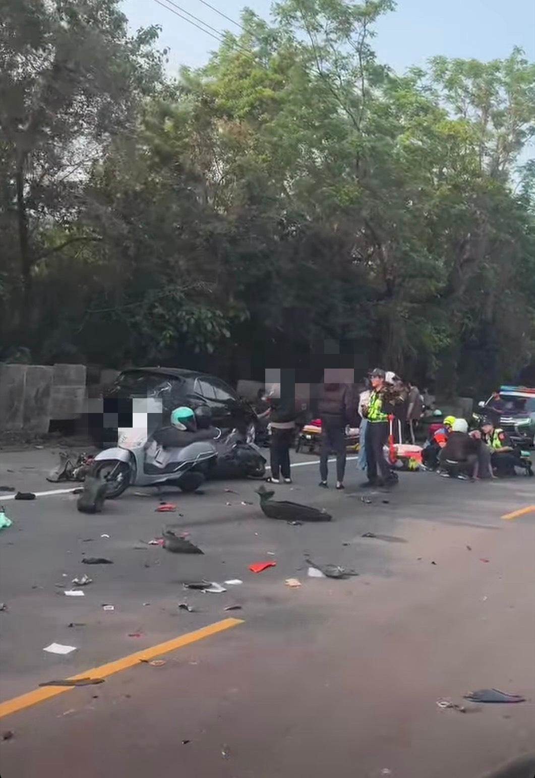 今(30日)上午在臺南安定河堤邊道路上發生重大交通事故,一位年輕女性開車時疑似精神不濟,逆向衝撞對向行駛中的機車群,釀成現場有人腳部肢體斷裂變形,釀成2人受傷,另有1人無生命跡象送醫搶救不治。