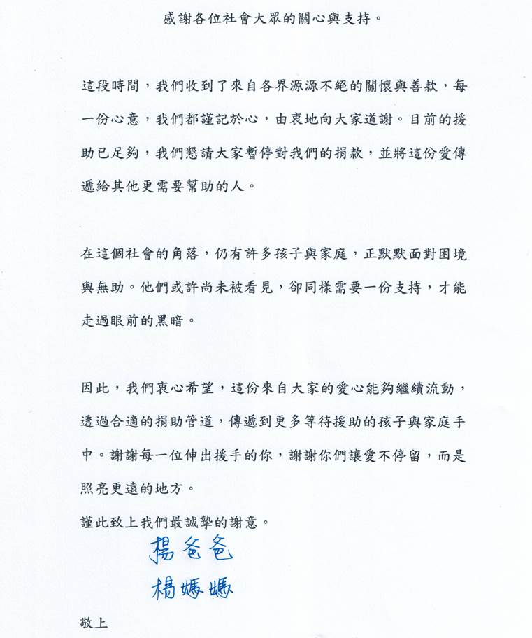 新北市府設立的專案募款部分已經超過原定目標,對此,受害家屬楊爸爸也發聲明向大眾說聲感謝。
