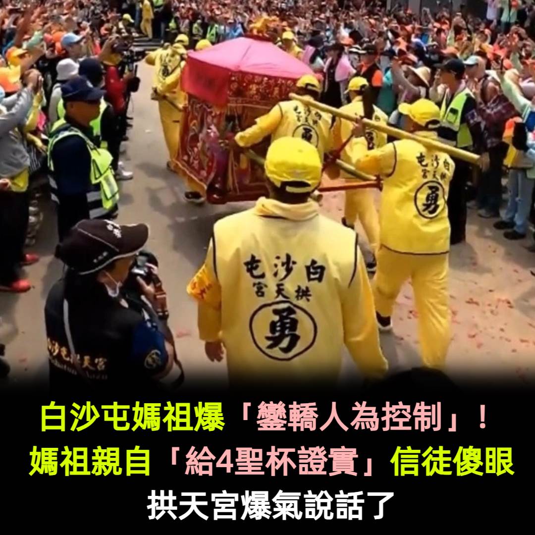 根據《ETtoday》報導,白沙屯拱天宮媽祖進香數萬人參加追隨媽祖腳步,期望可以得到多一點保佑,但現在有個YouTube頻道出面指控,拱天宮的「粉紅色超跑」是人為控制的,還親自獲得媽祖4個聖杯證實,也讓拱天宮爆氣回應!