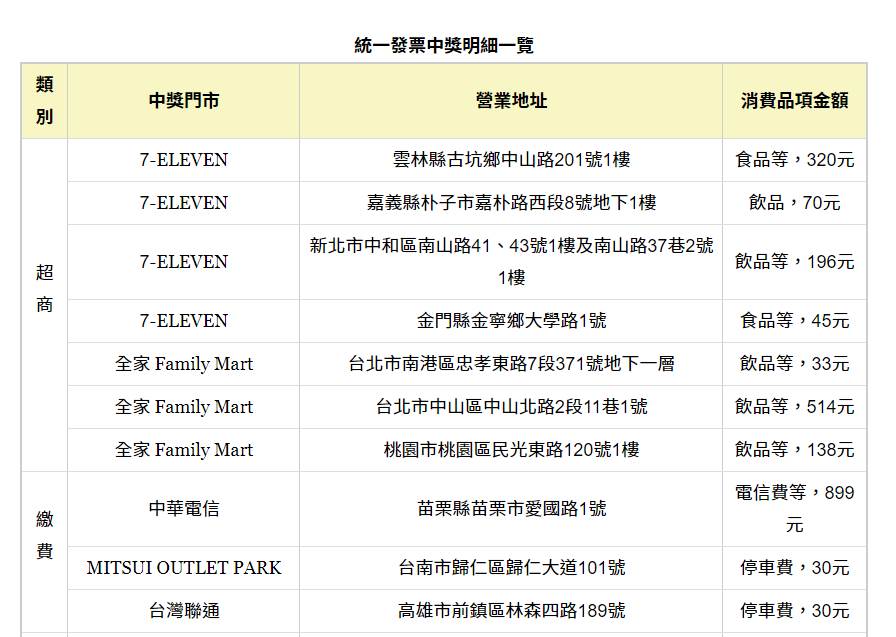 財政部4日公布民國114年09-10月期統一發票中獎清冊,開出11張特別獎(新台幣1000萬元)及18張特獎(200萬元),共29位消費者爽中大獎。本期中18張特獎者,共分為繳費、購物、餐飲、超商等類別,其中以超商中獎機率最高,7-ELEVEN共4人,全家3人,繳停車費2人、繳電話費1人;餐飲類方面,南港LaLaport、先喝道、寶昌食品各1人;購物類中,App Store、蝦皮購物、寶雅、街口支付各1人,TMS全鋒事業1人。